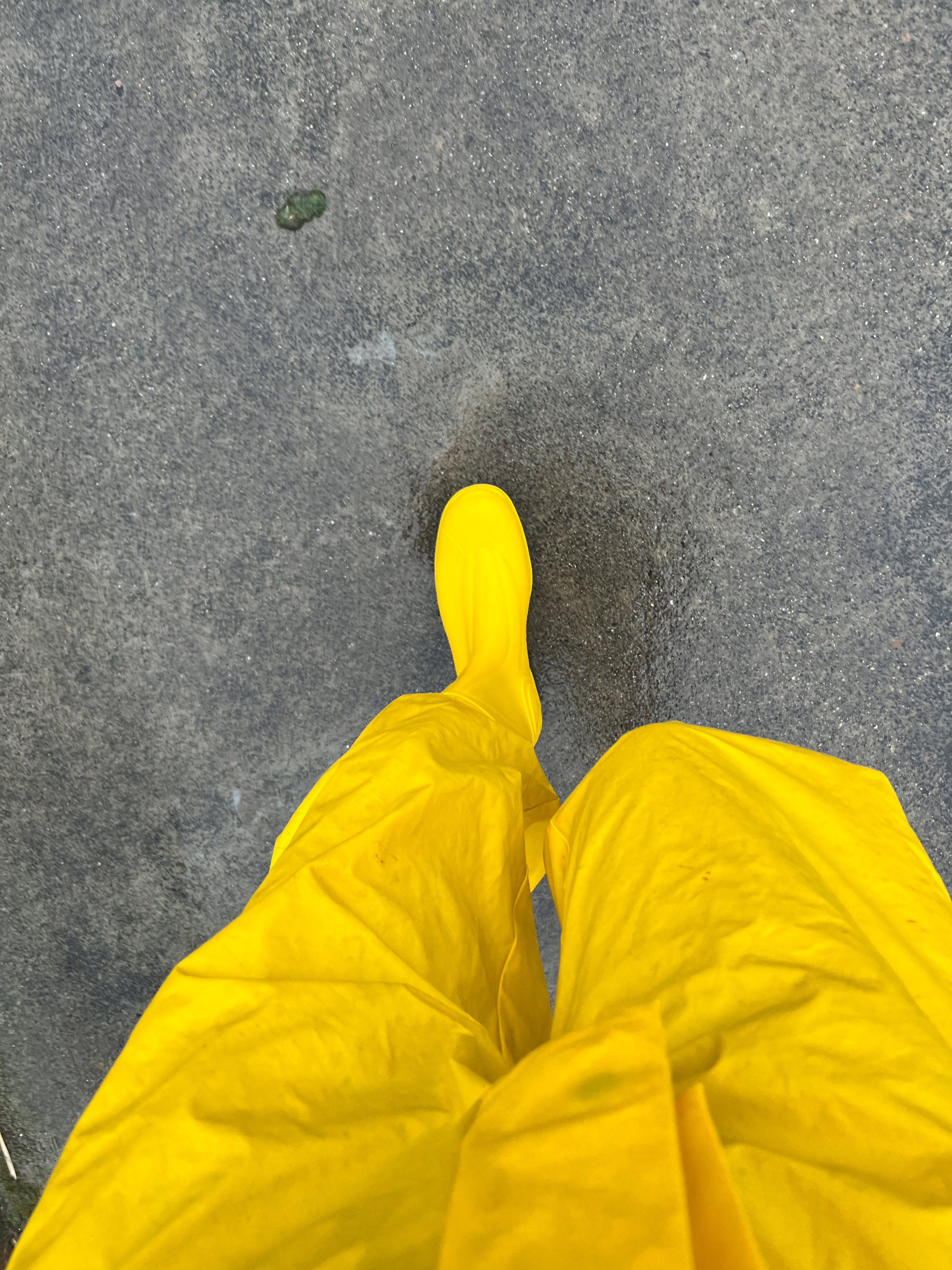 Het klussen ging door mijn geile hoerige straat wat lastig… en had het toch wel erg warm, en bij bukken deden de prikkers me zeer, maar alles voor mijn Meester. Tussen de middag wandelen met gele regen overall en gele kaplaarzen over mijn latex , wel ging masker af.