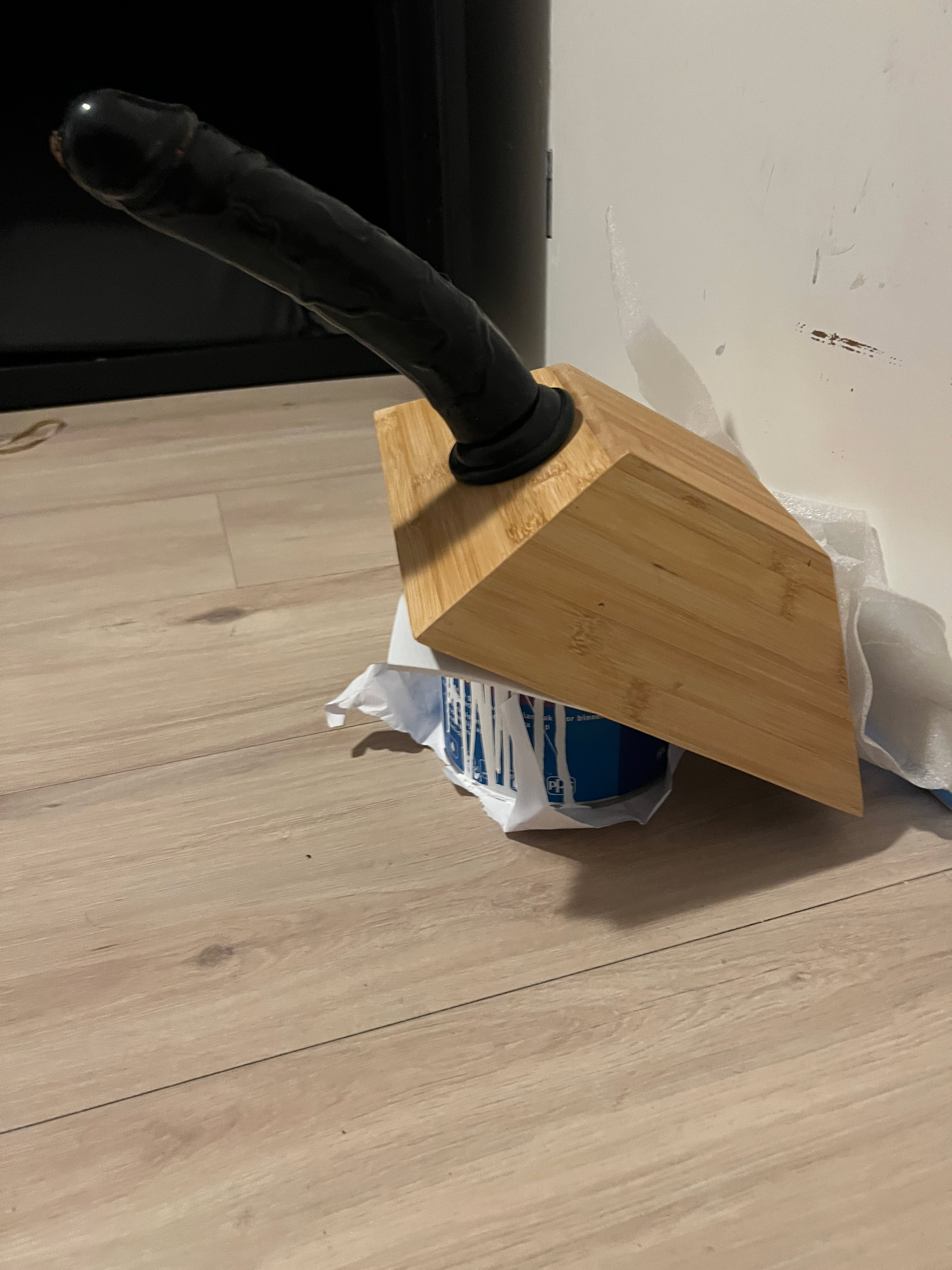 Ik heb nu de pijp dildo op een plankje op een driepoot gemaakt ( demontabel ) en de XXXL 8 inch dildo op een schuin bakje zodat die met de juiste hoek in mijn gewillige kut beland.