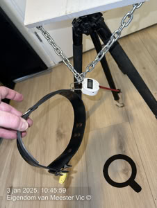 ik heb een korte ketting aan de plank gemaakt waar een hangslot timer aan kan en daar vervolgens een halsband om( of vast aan de halsband die ik al om heb.