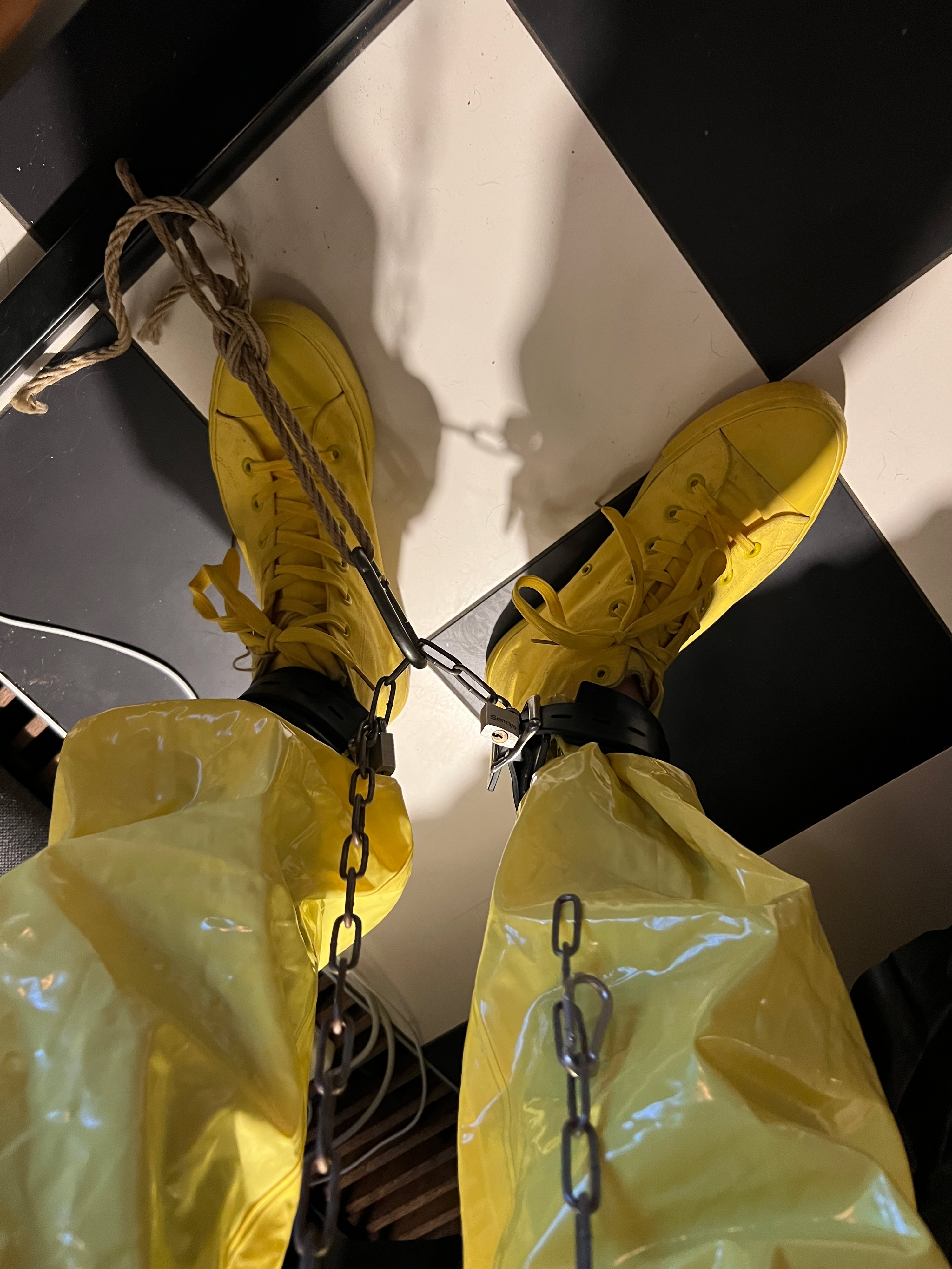 Latex prikslip , Martelpads ,Mouwloos catsuit,Transparant masker,Penis propgag,Gele pvc suit ,Gele Converse,