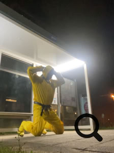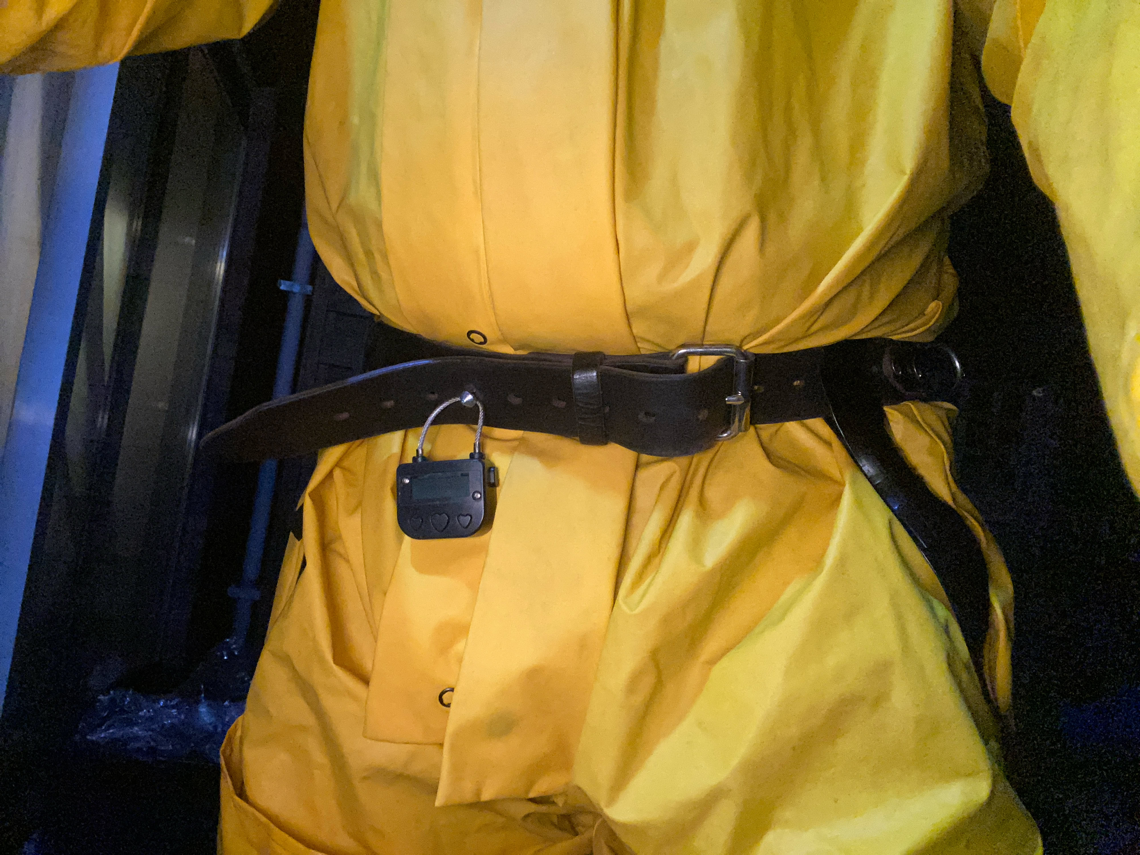 Nadat ik los kwam, was ik al redelijk toegetakeld en moe, maar ja opdracht is opdracht en alles voor mijn Meester. Dus gele opvallende regen overall aan en de gele lieslaarzen met banden die ze om hoog houden met riem rond middel. De riem ging op slot met timer voor 30 minuten wandeling. Ook deed ik de rubber halsband met groot slot rond mijn nek over de regenoverall heen, goed opvallend. De grote penisgag zat nog netjes in mijn hoerige pijp bek.
