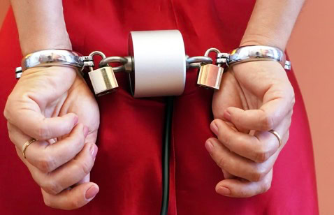 De Magbound werkt met een magneet slot dat2 haken heeft, die dan aan elke pols vastgemaakt kunnen worden.