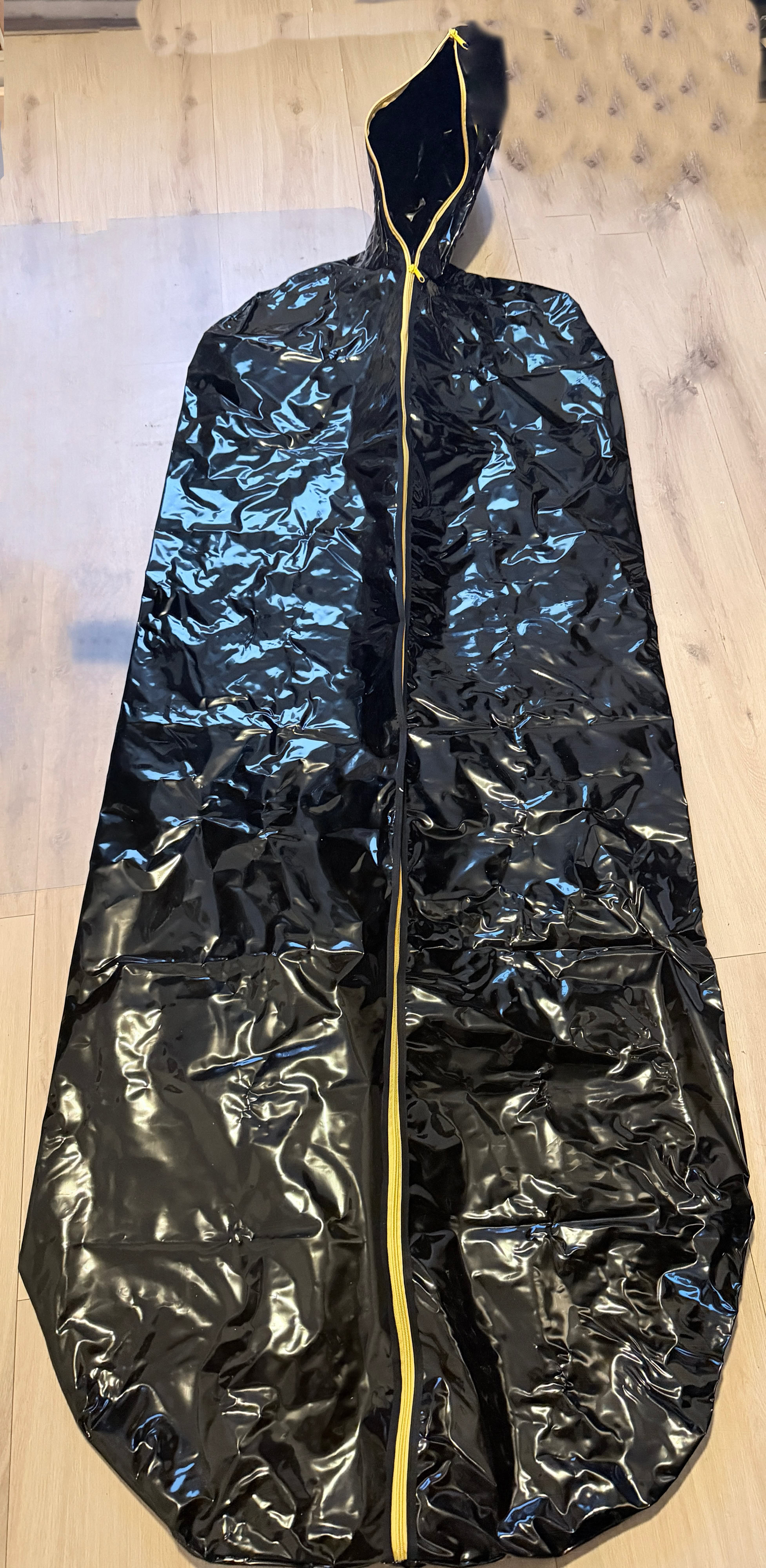 Pvc zwarte body bag met gele rits.