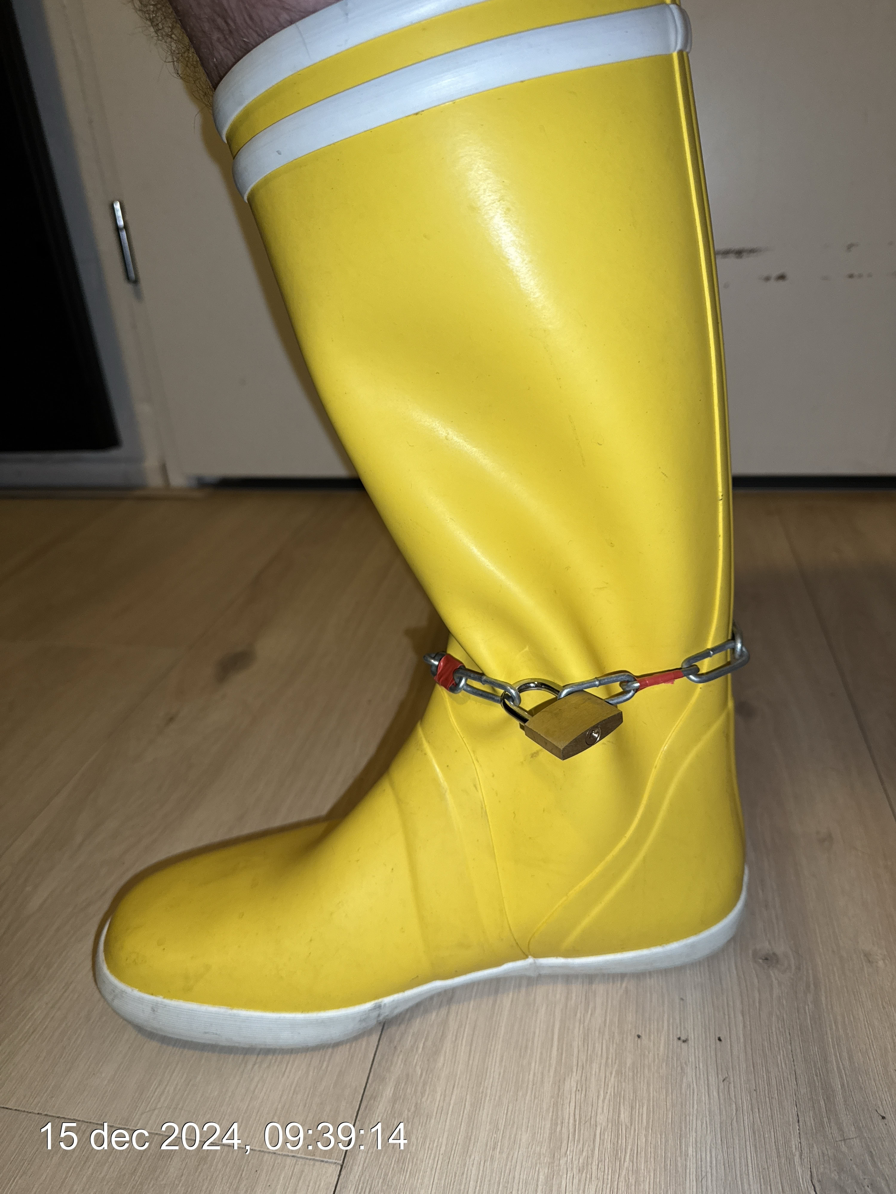 deze kunnen in mijn gele laarzen, deze kunnen in de leren afsluitbare straf sokken zodat bij het lopen ook daar de nodig prik zal komen. Een slaaf moet afzien