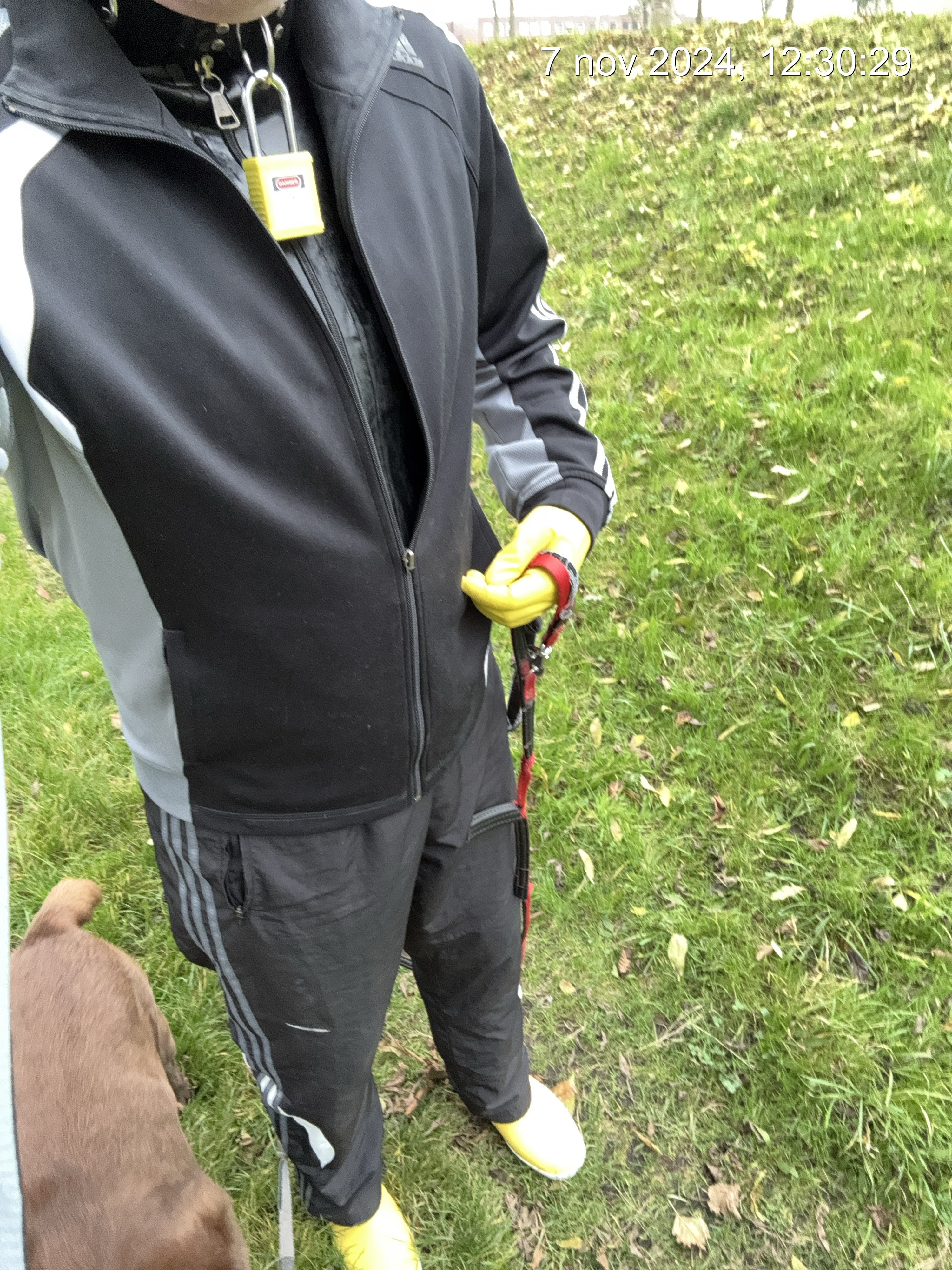 Tussen de middag moet ik dus de honden wandelen, dit doe ik door mijn masker en gag af/uit te doen, en vervolgens een trainings pak, of als het weer zo is een regen overall er over. Zodat mensen in de buurt niet geschokkert worden van iemand in fetisj gear.