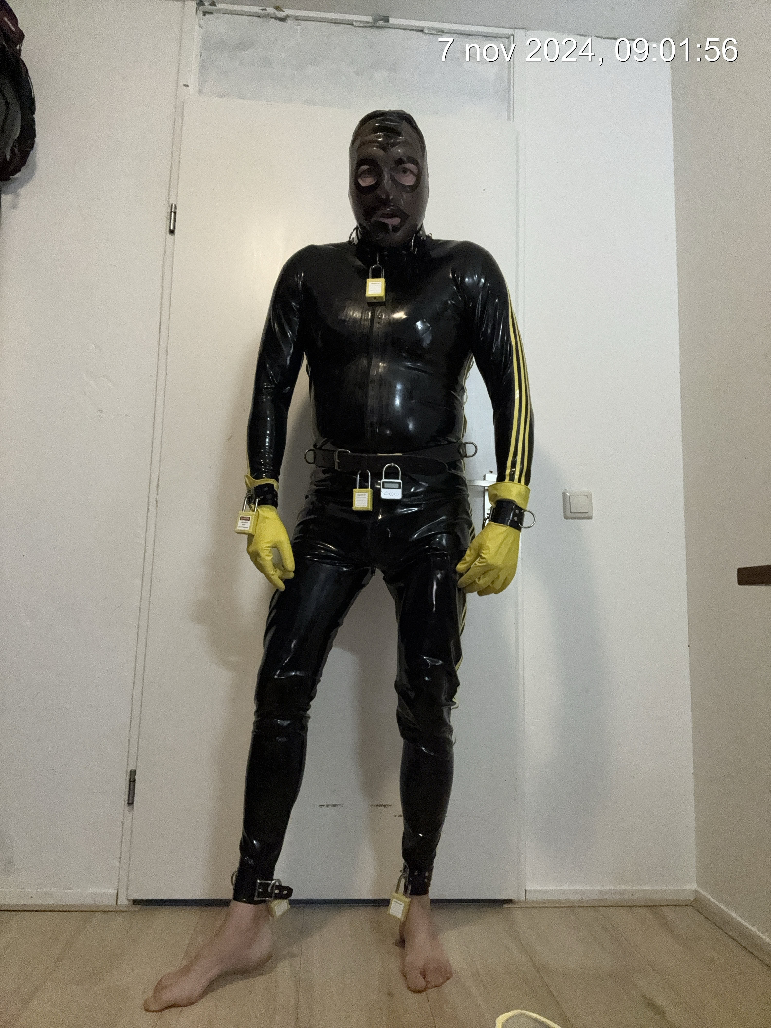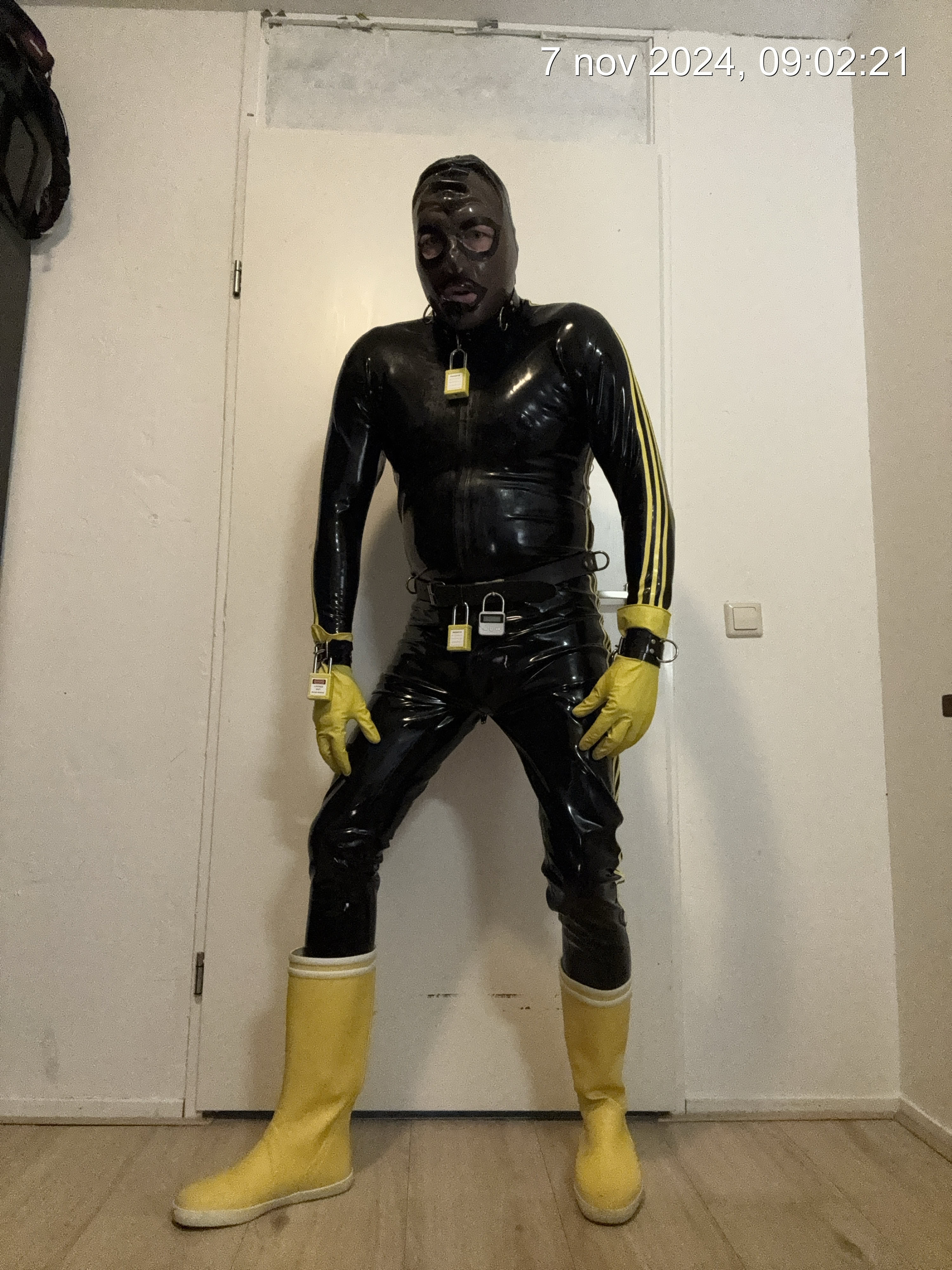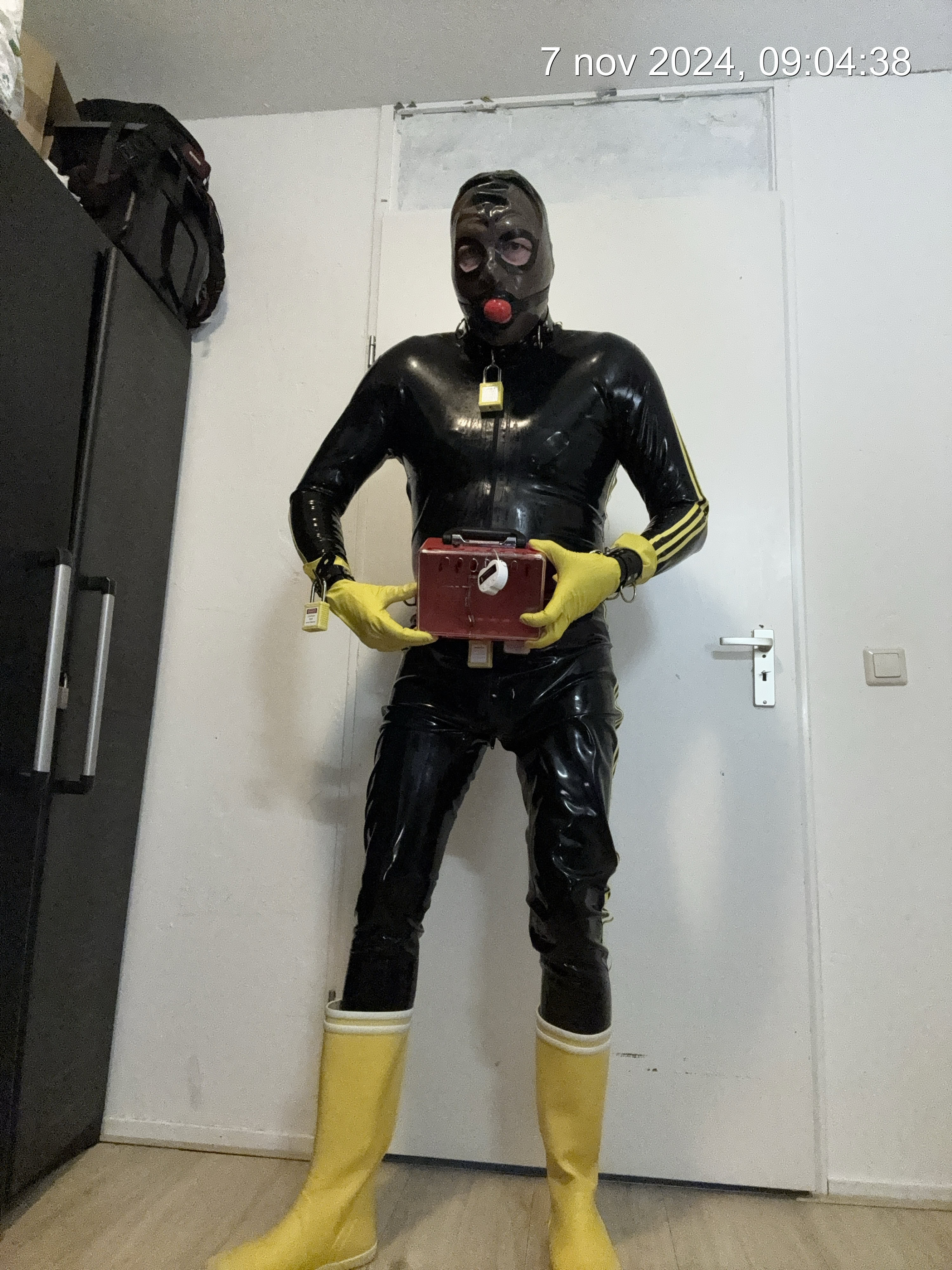 een plug in kut ( kan ook remote hush toy zijn) prik boxer latex catsuit, prik pads op spenen, rubber gele laarzen, rubber gele handschoenen en alles met pvc boeien set met gele sloten op slot. Latex masker en stuffer gag de hele dag op en in. ( gag mag even uit voor werk telefoontje, eten tussen de middag en de middag wandeling met hond.