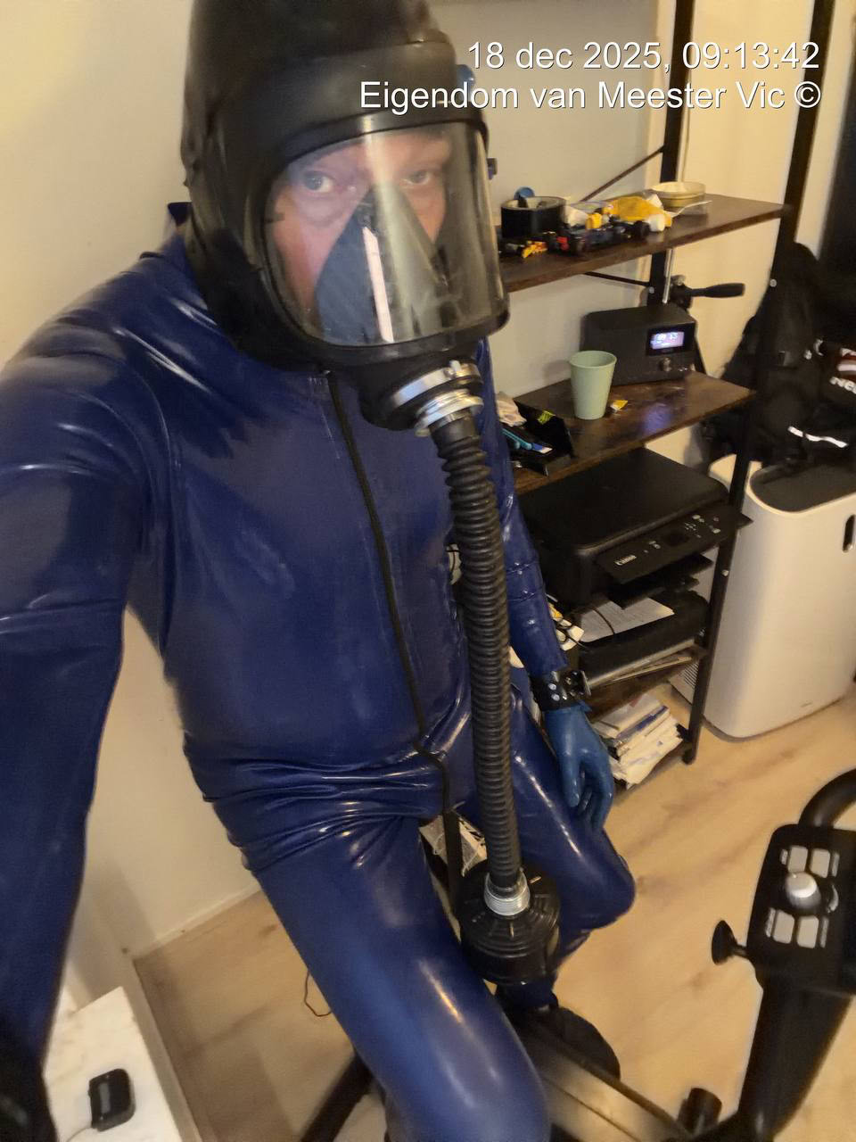 Nadat de piepjes van de sloten weer voor de nodige paniek gevoel had gegeven was het tijd om 30 minuten en Stilaan tempo en weerstand opdrijven was de opdracht, wat het zwaar ademen door de slang en filter natuurlijk extra intens maakte, waar de pis geur voor mij als poppers werkt en mijn compleet tot waanzin maakt van geilheid.