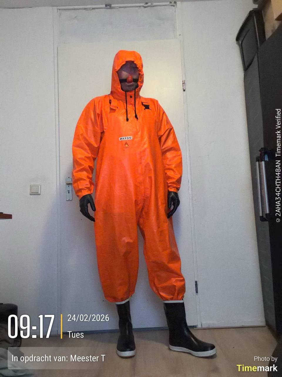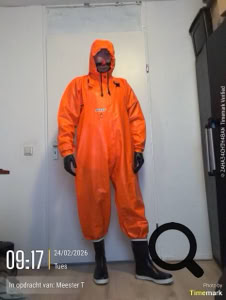 Om alles te “verbergen” de knal orange ocean regen pak met de beitels over de jas, omdat dit meer fetish look is ipv functioneel regen kleding.
