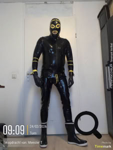 Aan mijn voeten deed ik de pro sloffen die op slot gingen en zwarte rubberen laarzen. Zwarte latex handschoenen aan waar ik wel wat moeite mee had om daar zichtbaar buiten mee te moeten lopen, maar opdracht is opdracht. Geel electra tape er om heen voor de nodig zweet tegen te houden en polsboeien met slot daar weer over.