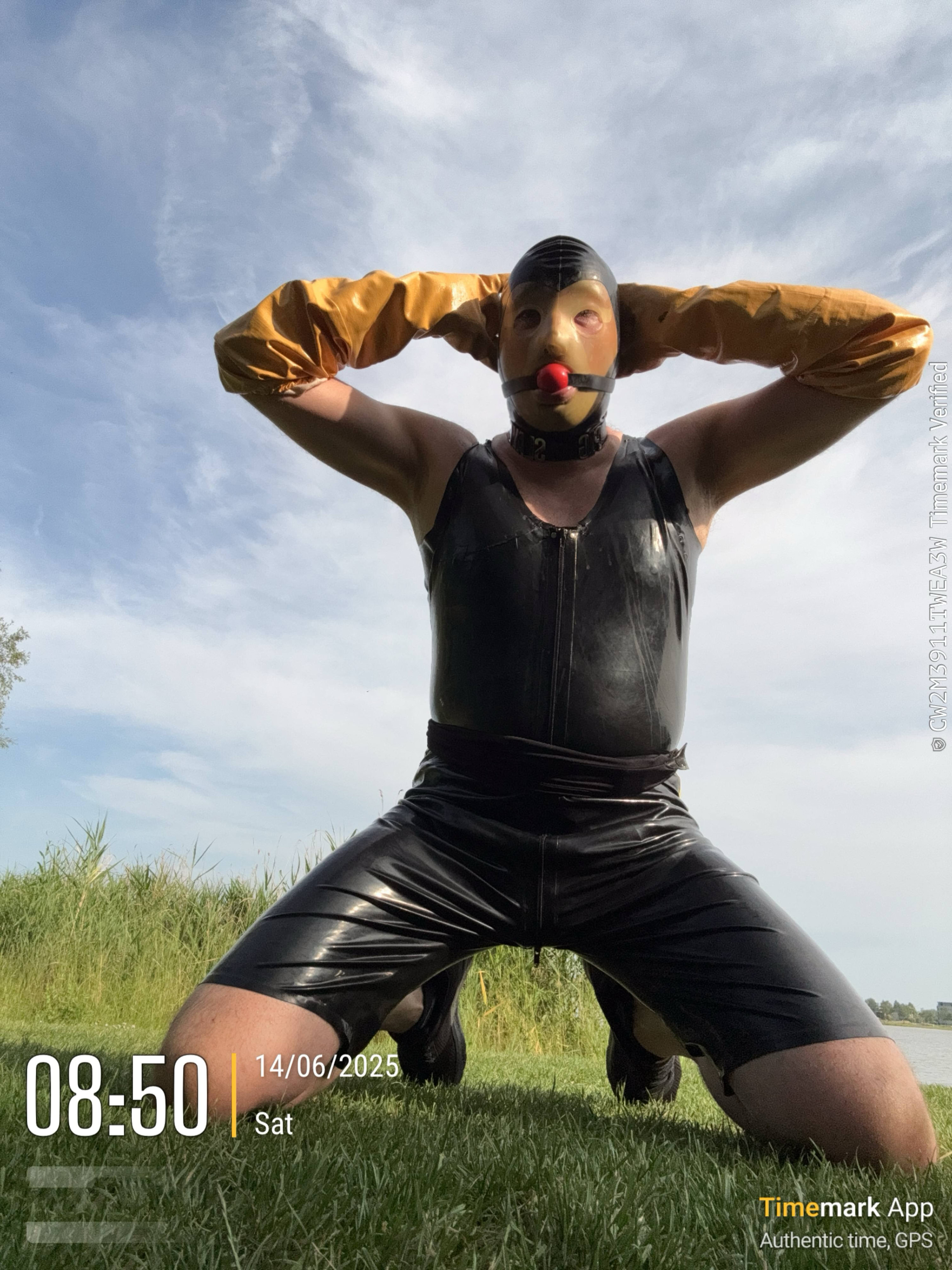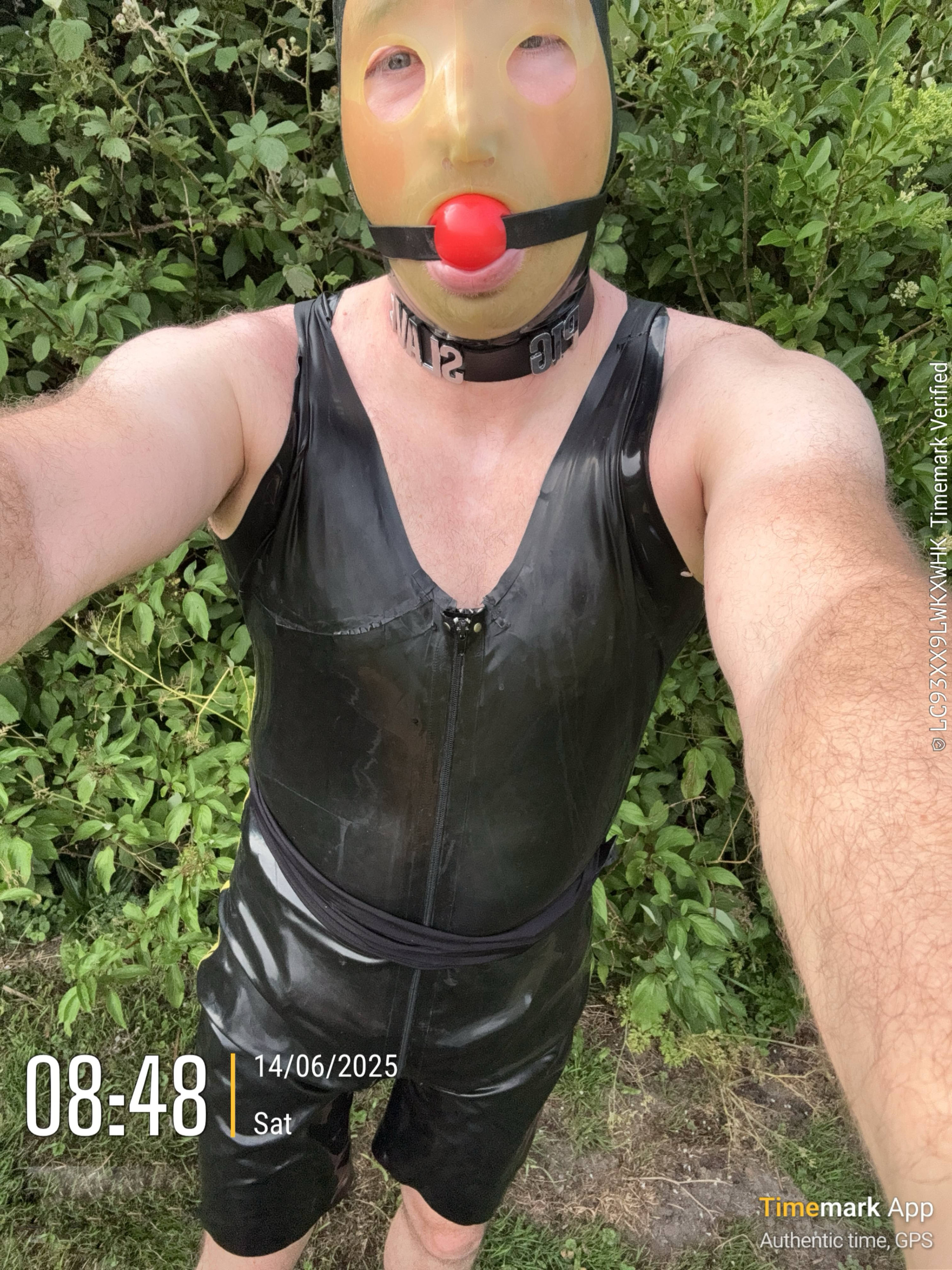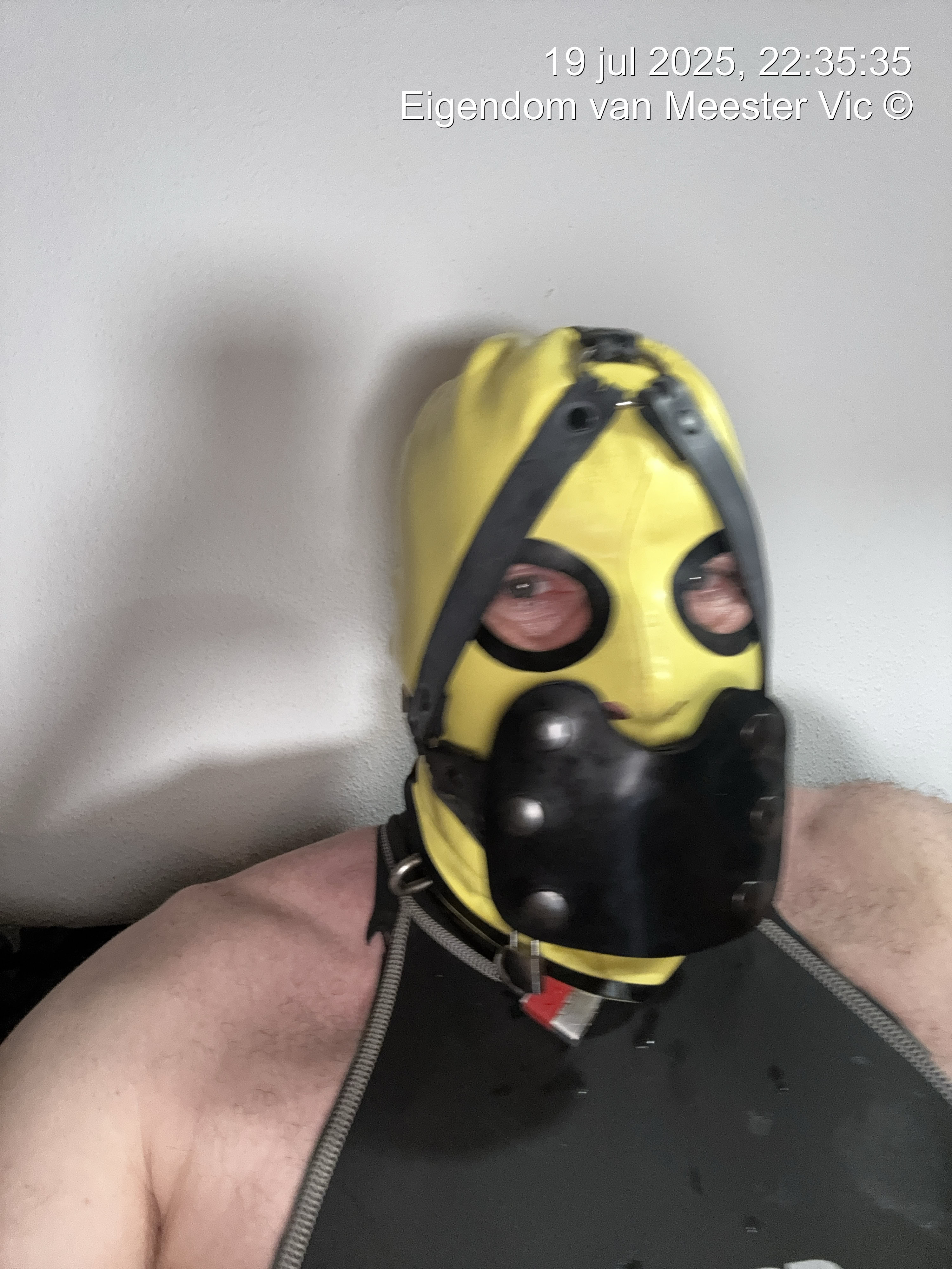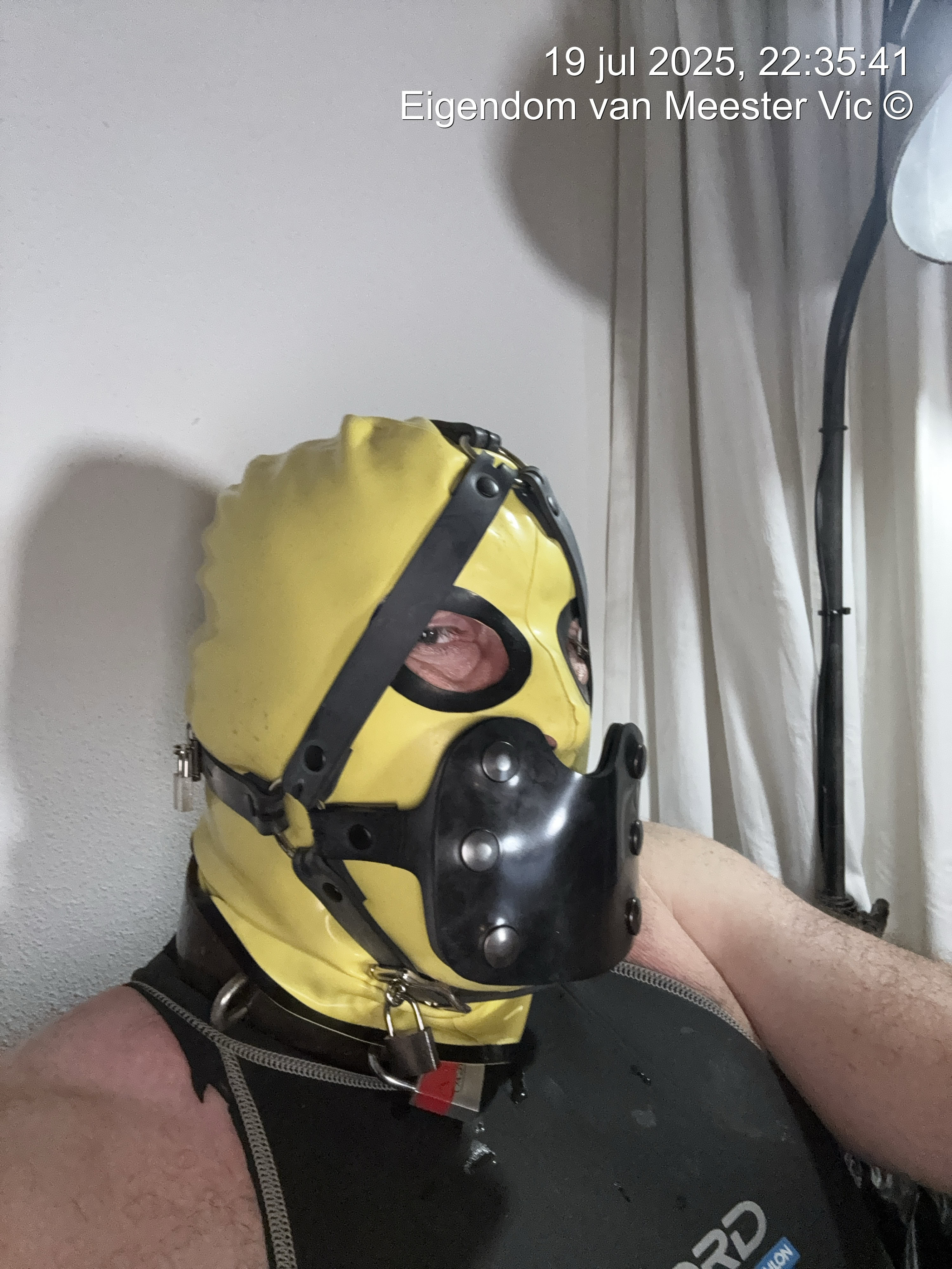 Gear : prik sloffen , gele laarzen , geel/zwart latex suit, latex masker, gag , xxl plug met harnas. Voor bondage : ketting voor tussen enkels , pols boeien en ketting voor pols , lange ketting voor bondage in wc huisje , timer hangslot een set gele hangsloten die gelijk sluitend zijn