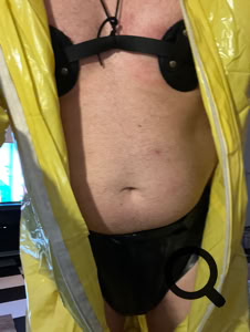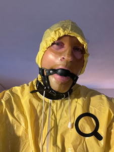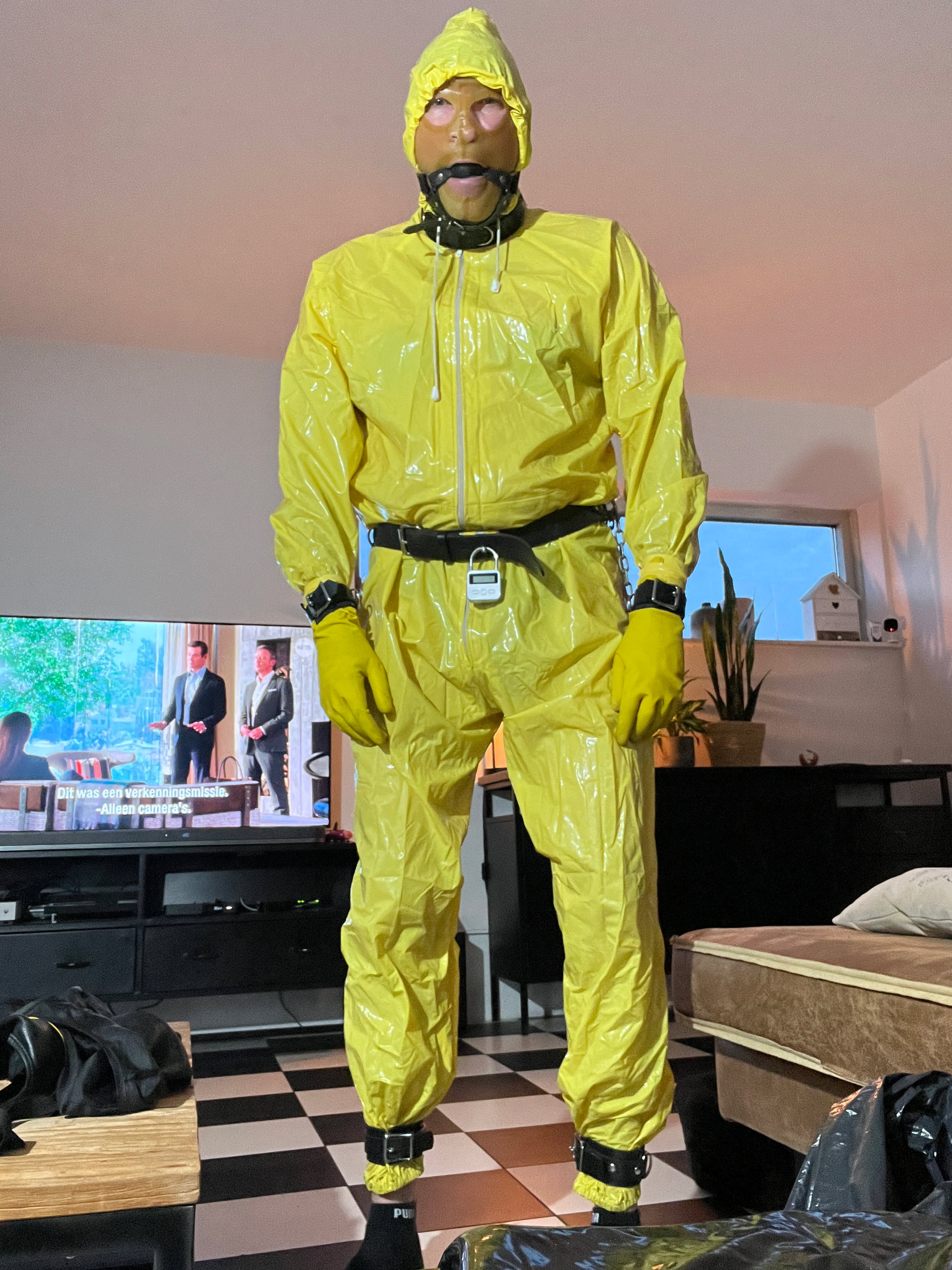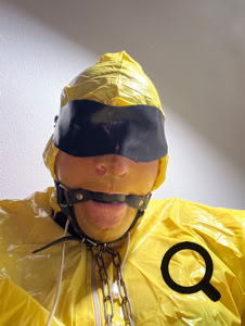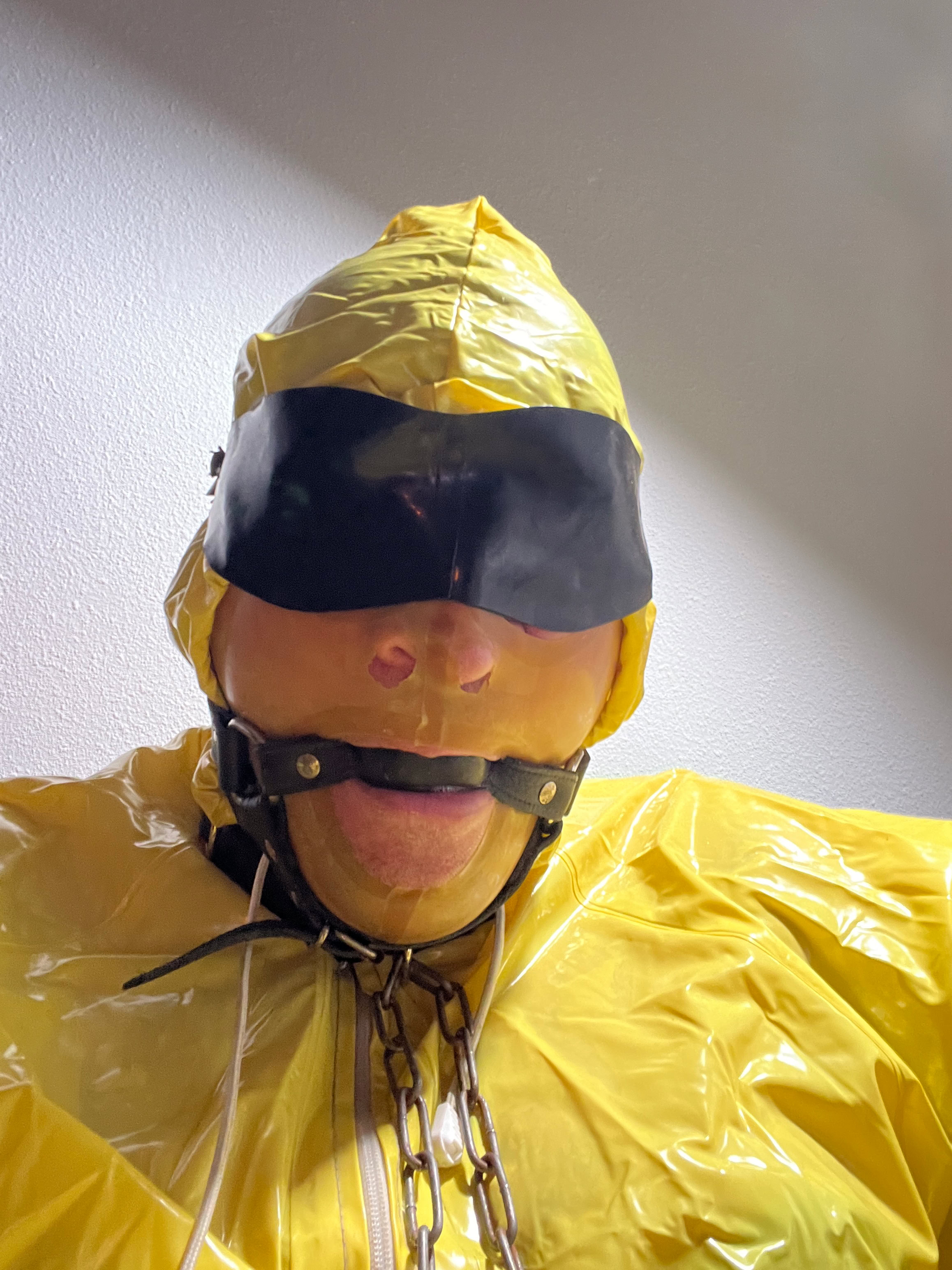Prikslip, martelpads,  gele pvc suit, semitransparant masker,  balgag,  alles strak vast in bondage gedurende 1u20min.