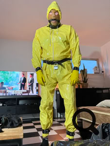 ik deed rubber handschoenen aan en deed met tape ze vast zetten aan de pvc suit. Achter af had ik ook iets aan mijn voeten moeten doen.