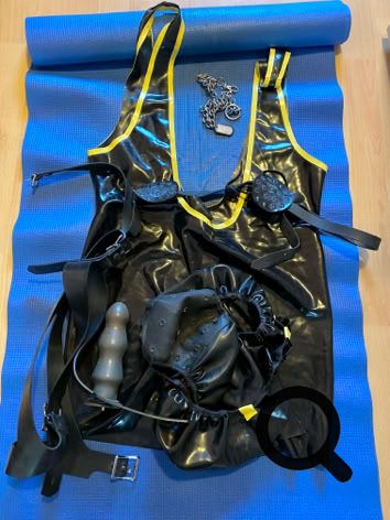 latex bondage suit op slot tot 12:30 pauze wandeling met honden , alles aan ,