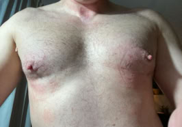Om 12:32 eindelijk de piepen van de kluis om even verse lucht op mijn hoofd te hebben voor een korte wandeling met de honden. Een rood trainingspak had ik over mijn latex gedaan, maar de handen waren zichtbaar in de latex .