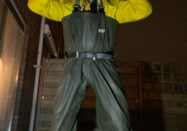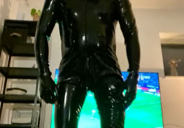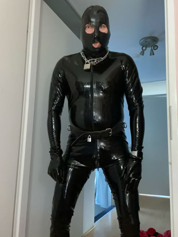 in mijn latex scuba suit met er onder mijn latex prik slip die mijn billen/ballen , op mijn tepels de martel pads die tijdens de sessie alles goed misbruikte.