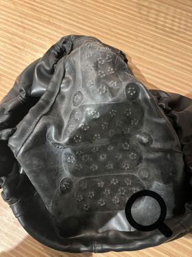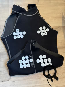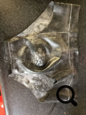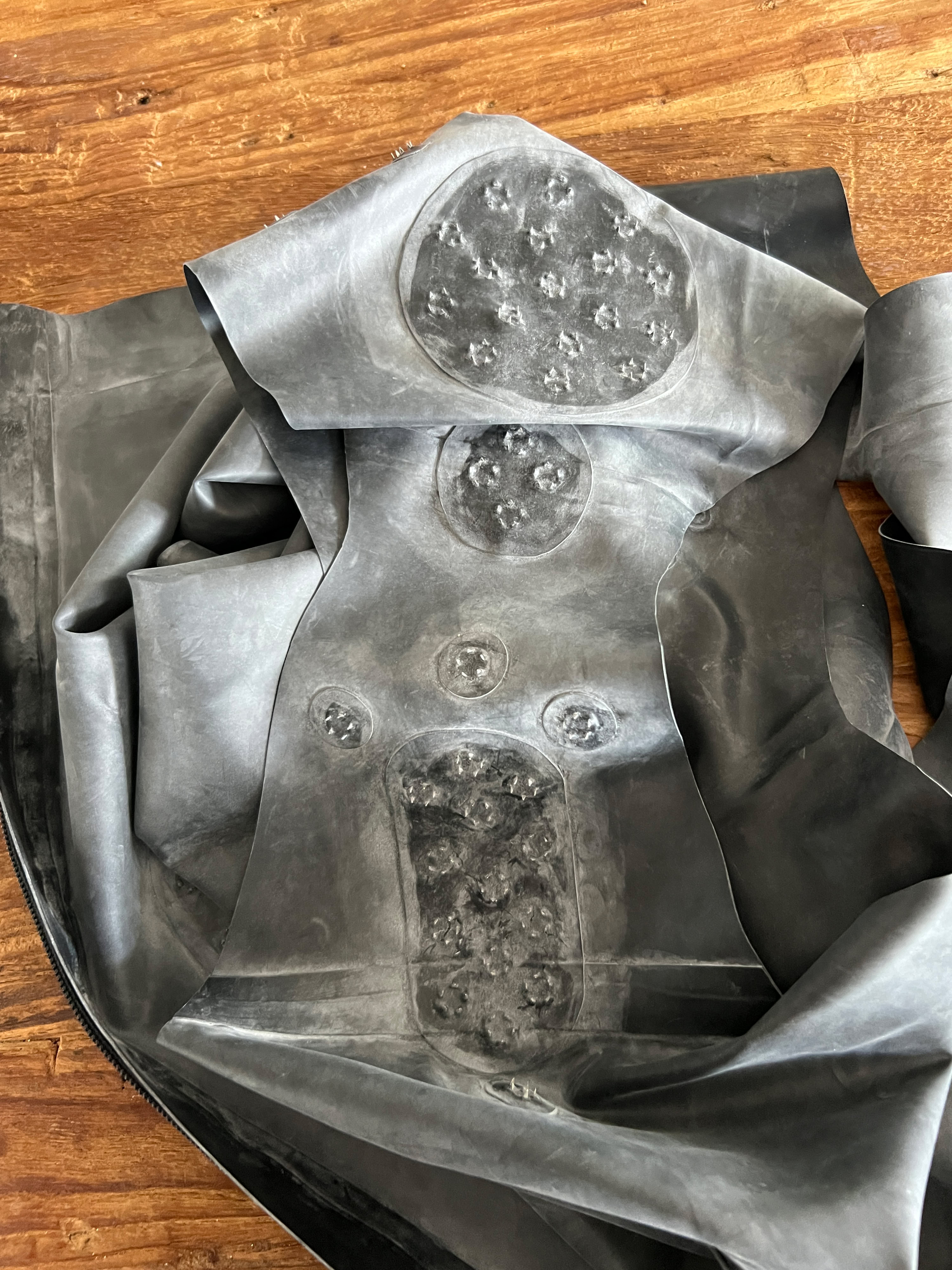 Van strakke vinyl body heb ik met de prik schijfjes een martel body gemaakt. gepijnigd te kunnen worden, incl timer slot rond nek