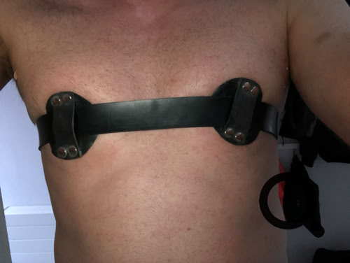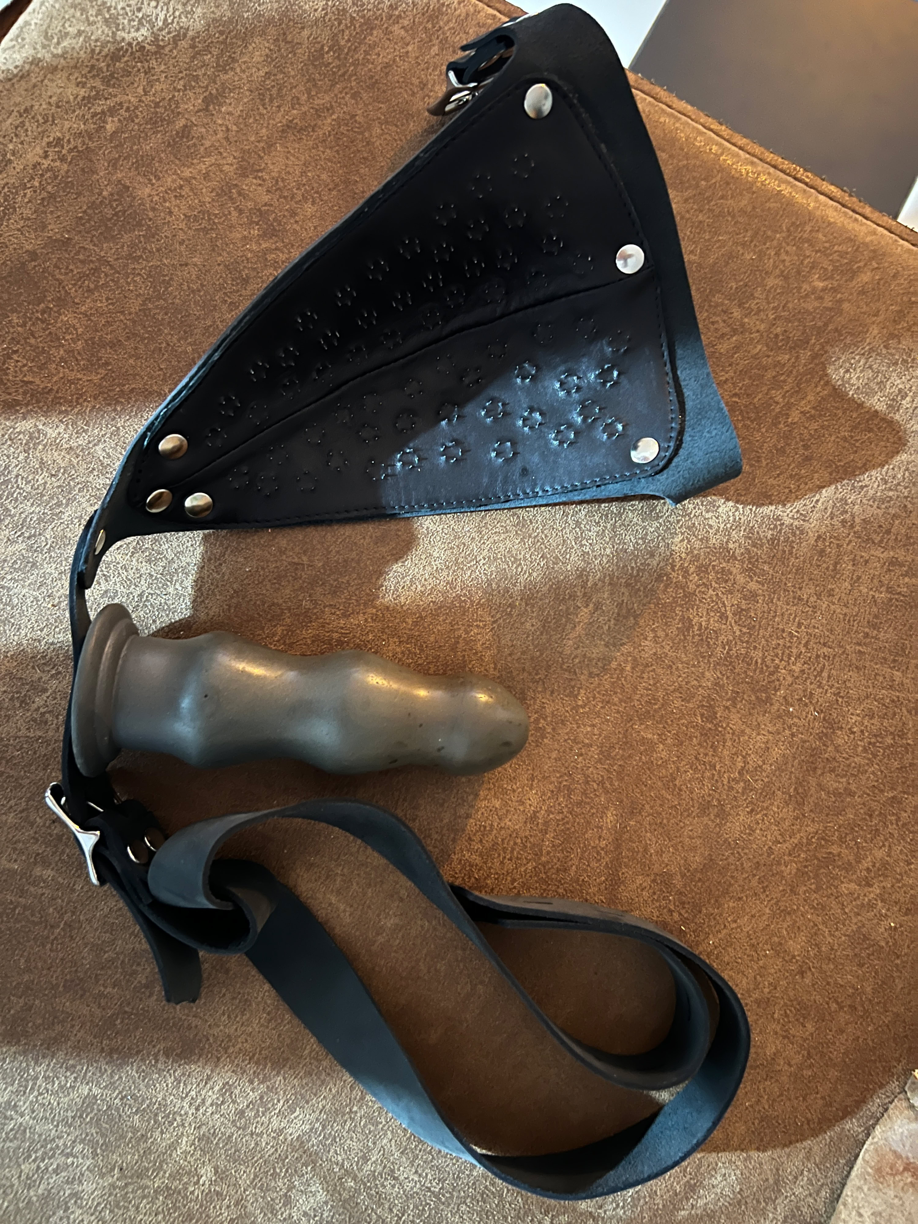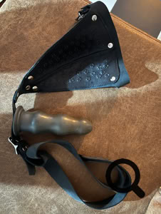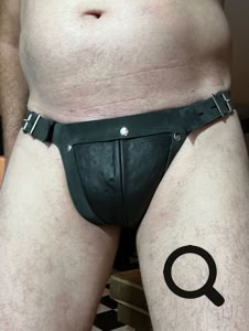 Een leren prik jock waar ook een dildo op vast kan, met deze jock kan ik niet rond lopen