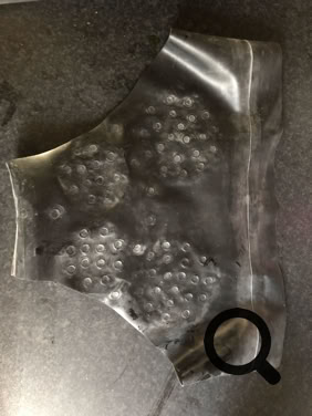 Omdat mijn Meester mijn constant pijn wil doen en in het weekend overdag een prik boxer te weinig is, een zwarte Van zwart vinyl body heb ik met de prik schijfjes een martel body gemaakt. gepijnigd te kunnen worden.