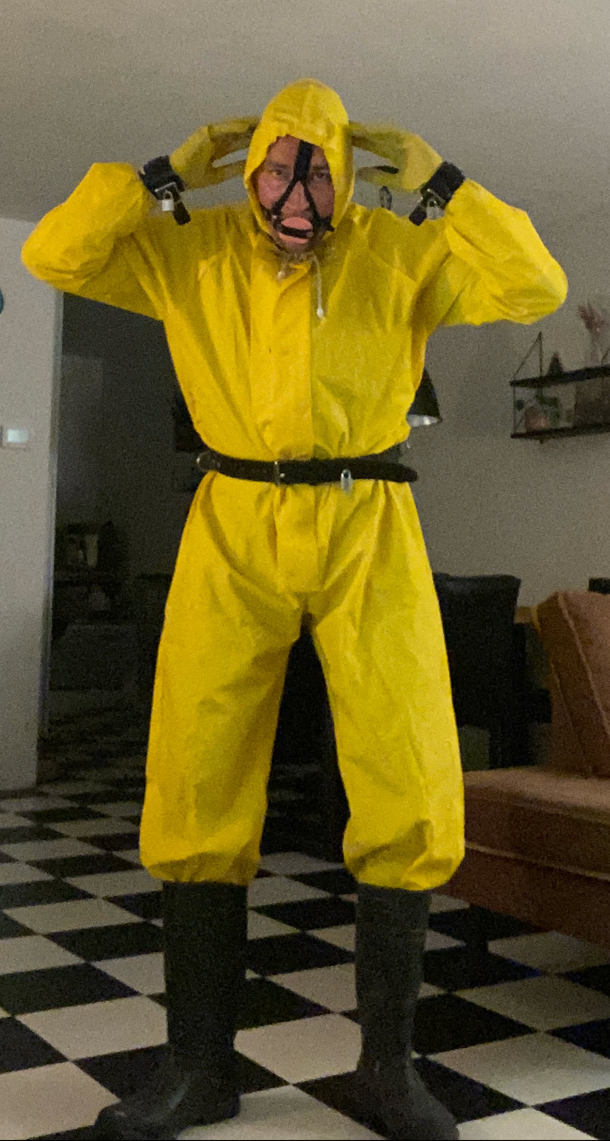Als mijn Meester vind dat ik straf verdien, en onder de overall een te grote plug en prik pul moet dragen voor bepaalde tijd moet ik mijn STRAF overall aan