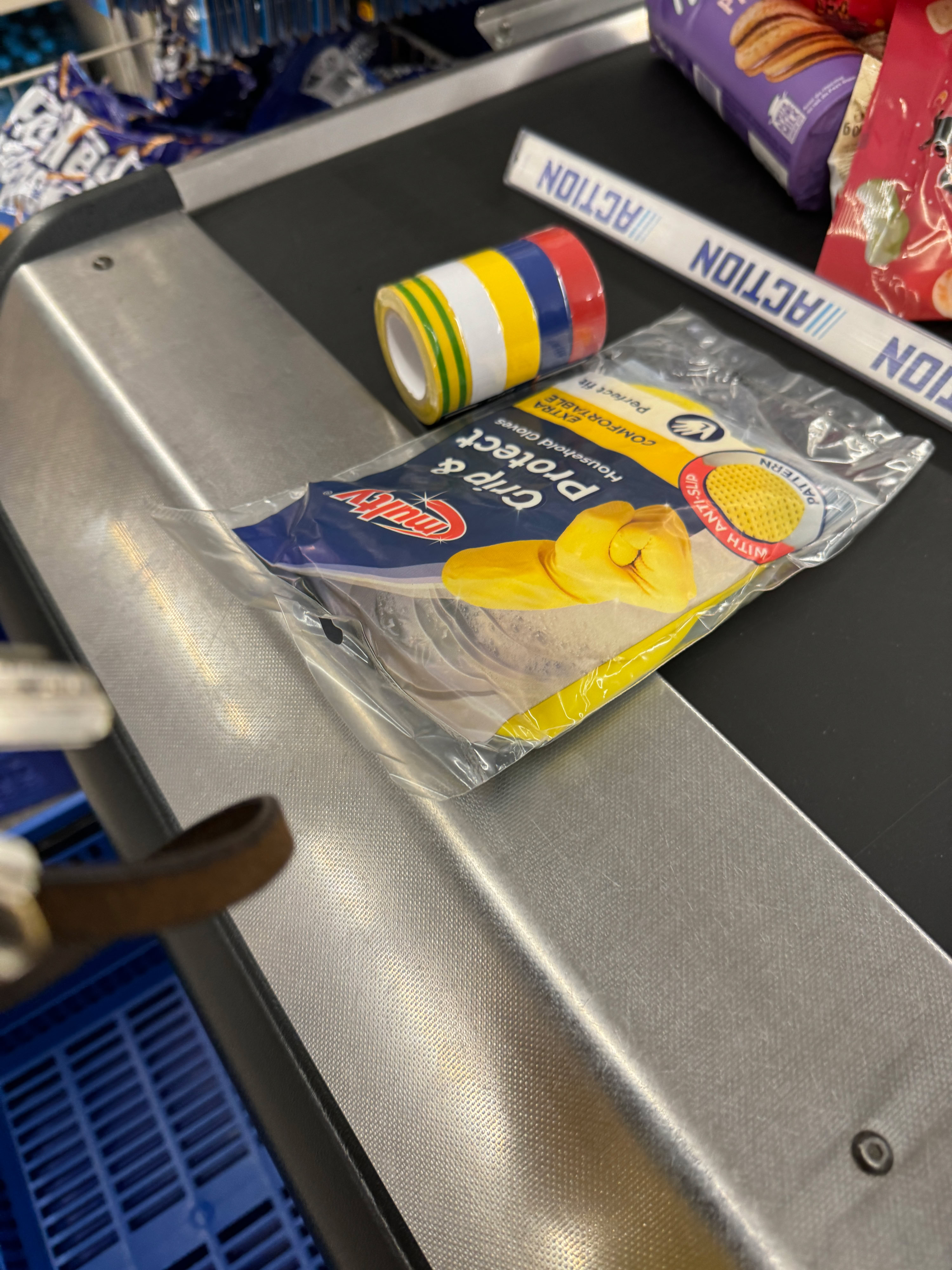 Nadat ik alles thuis had aangetrokken, ging ik met de auto naar de action winkel om daar nieuwe rubber handschoenen te kopen en tape om die soms vast te maken aan suit. Na een kort ritje van 5 minuten de auto uit en gelijk een drukte van mensen om me heen. Verschillende keken me ook wel aan, maar ik zet met dit soort vernederende buiten opdrachten mijn verstand op nul en denk fuck it.