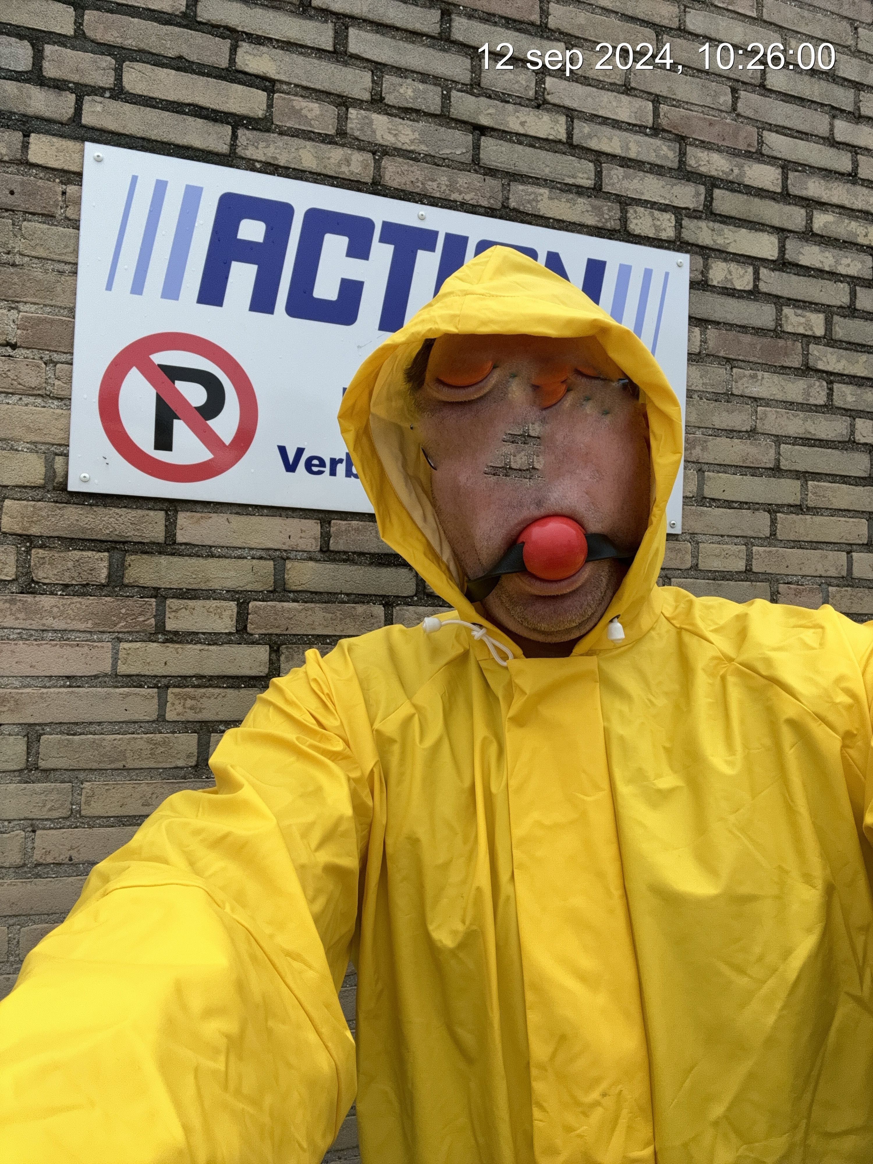 Omdat ik een paar nieuwe rubber laarzen had besteld in geel, en er regen was voorspelt kreeg ik de opdracht om naar een winkel te gaan in geel : dus over mijn latex ging een gele regen overall , de gele rubber laarzen, gele rubber handschoenen maar ook de stuffer gag moest in ….en de capuchon op hoofd. Dus geel.